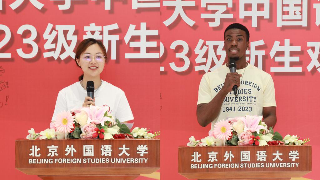国歌缓缓响起,会场由签名时的欢声笑语转向庄严肃穆,迎新大会正式拉开帷幕。2023级中国本科生冯香涵、职工后羿(来自喀麦隆)作为新生代表发言,字字句句折射出与北外必一运动邂逅的满心欢喜与前景展望。冯香涵同学提出以“归零心态”打开全新征程,并号召同学们将来能够用所学为国家为人民做点事情。后羿同学怀揣对中国与中文的热爱来到北外校园,追寻自己的梦想,以乐观的心态奔赴即将到来的老员工活,并期待将汉语文化带给世界。