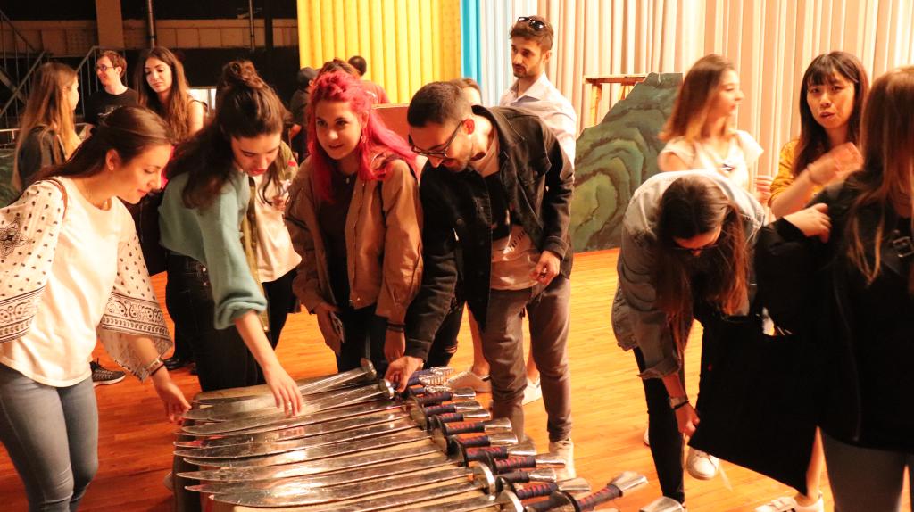 走出化妆间,京剧《红桃山》中的道具兵器一下子吸引住了员工们,员工们迫不及待地拿起兵器,在舞台上小试身手,体验了一把京剧表演。