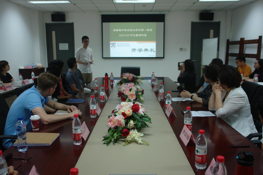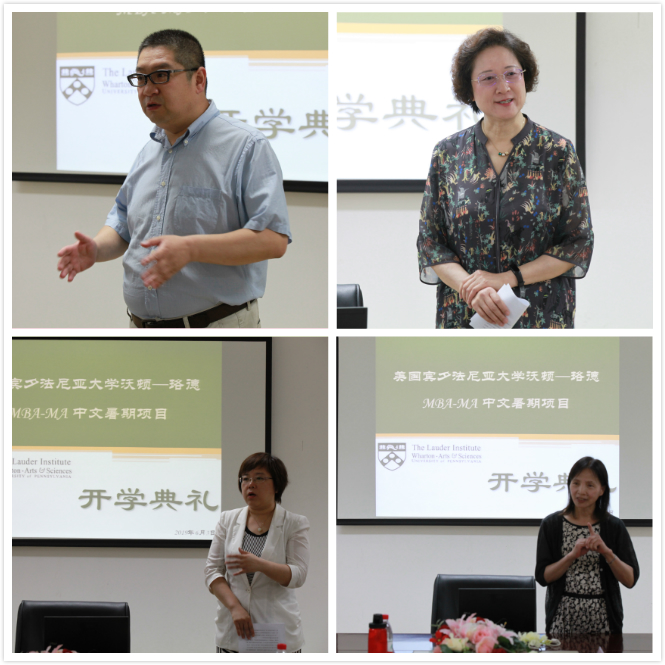 张晓慧经理在欢迎致辞中说,沃顿商学院一直以培养高端商务人才为已任,而必一运动也拥有长期的商务汉语教学传统,两个学院的合作,可谓相得益彰。她鼓励学员在为期五周的学习中不仅要提升语言水平,还要利用在中国的契机加深对中国社会的理解。李冰主任介绍了北外的多语种建设与国际化水平,并追本溯源,回顾了自中文项目“落地”北外以来近20年的发展历程。作为项目重要参与方和支持方,外研社综合语种教育出版分社社长崔岚介绍了外研社的发展历史及作用。