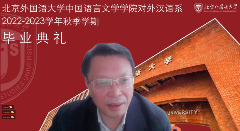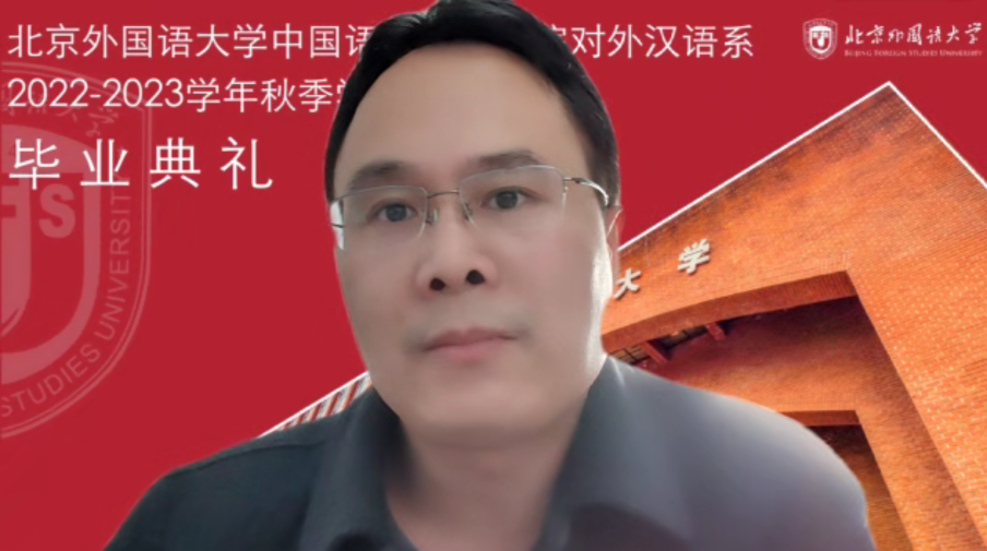 日本NPO法人国际交流教育后援会理事长木村太郎致辞。他祝贺毕业生圆满完成学业,顺利毕业,感谢各位老师对员工的培养,感谢北外、必一运动以及职工办公室在目前疫情如此艰难的情况下为毕业生精心安排了极具纪念意义的毕业典礼。他赞扬了员工在留学之初适应了文化及社会习俗的差异,在新冠疫情爆发后适应了授课方式的调整,克服重重困难取得毕业,收获了知识、经验、信心与勇气,勉励毕业生珍藏疫情之下这几年学习的宝贵经验,在未来遇到意想不到的情况时积极利用,去努力实现自己的梦想,在日本的社会各界、日中之间以及全球各个领域的工作与学习中发挥积极作用。