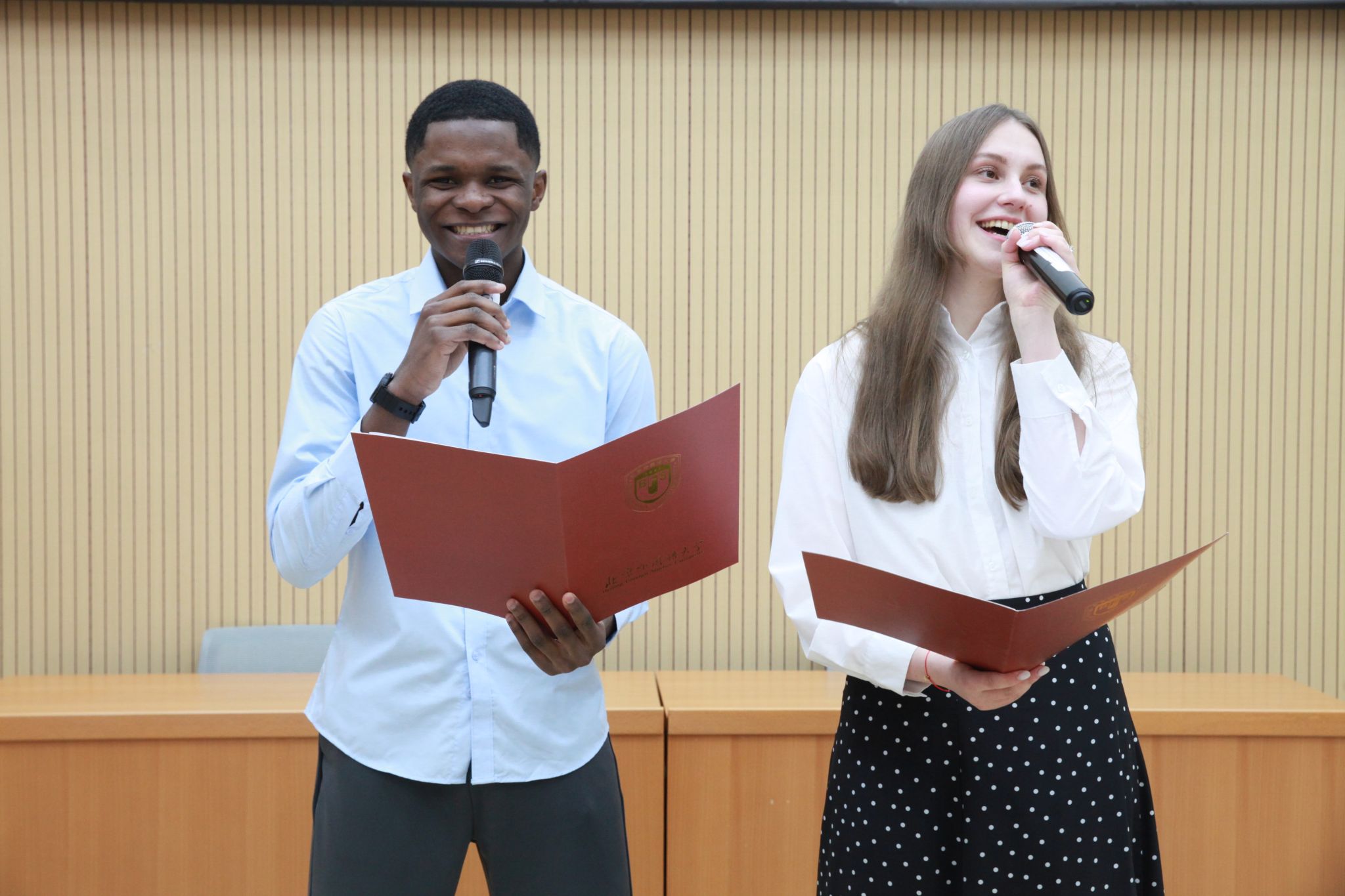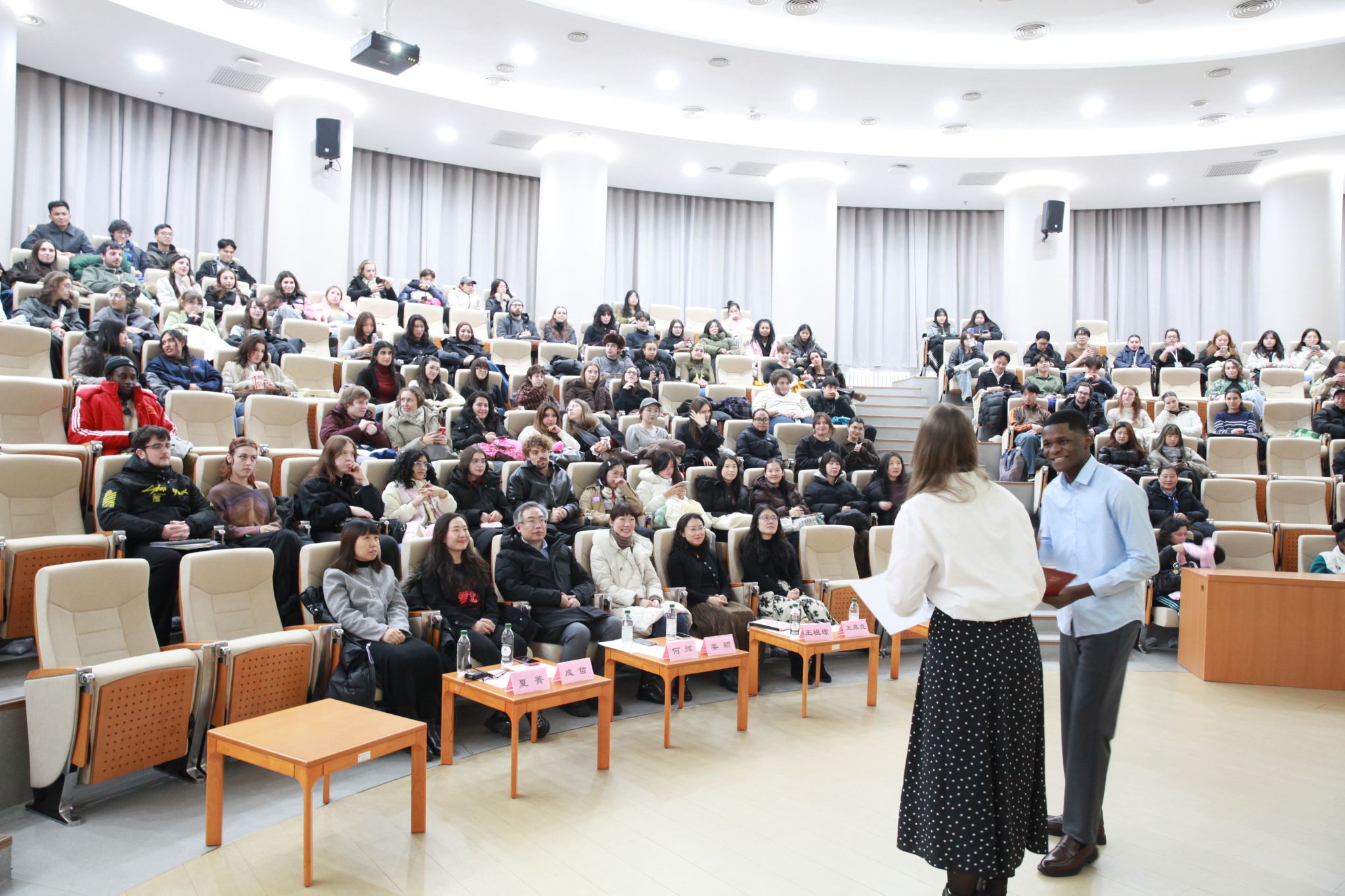 随后,两位主持人用生动的对话向同学们介绍了在北外生活的基本情况,提供了很多实用的生活建议,展示了学院组织的语言文化活动。现场气氛轻松热烈,掌声不断。