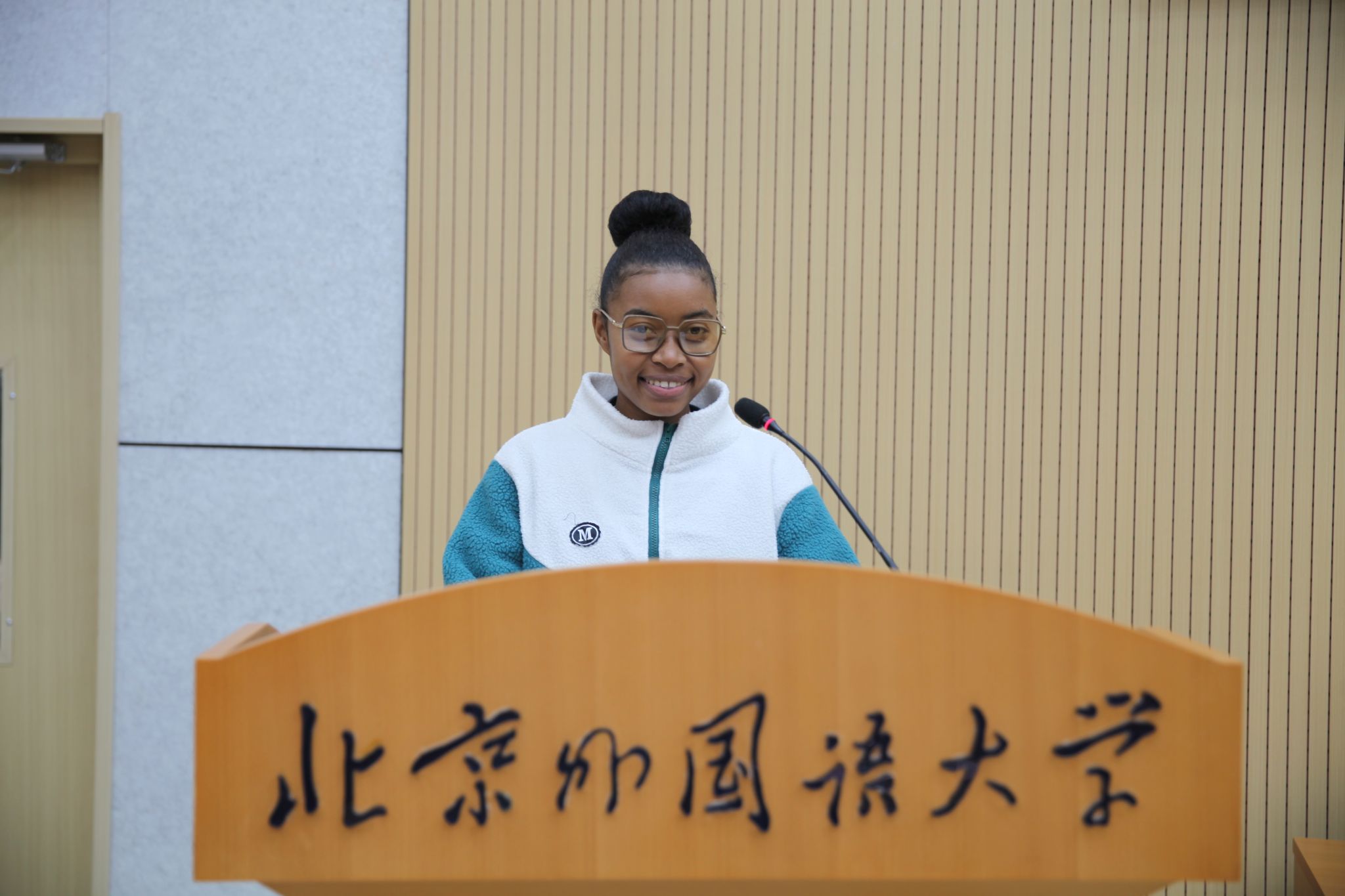 来自马达加斯加的新生代表李婉君分享了她与中文的缘分:从觉得汉字难写、发音不准,到在老师鼓励下坚持学习,最终圆梦北外。她表示,来到全新环境难免遇到挑战,但只要保持积极心态,勇敢面对困难,就一定能不断成长。她号召同学们共同努力,积极参与校园活动,收获属于自己的精彩。