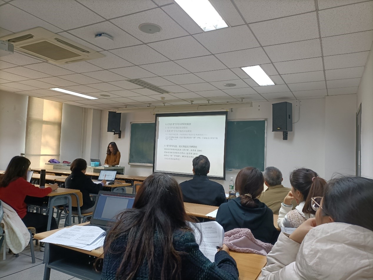 钱一华汇报的主题为“汉语学习者‘把’字句与主动宾句交替的多因素研究”。该研究采用构式交替视角,借助多因素分析方法探究了本族语和中介语中“把”字句和主动宾句的交替现象,检验了多个形式、语义和语用特征对两类构式交替的影响。报告指出,中介语相关特征的发展并非同步,呈现出从形式特征到语义特征,最后再到语用特征的发展顺序。采用逻辑斯蒂回归分别对本族语和中介语语料中两类构式的交替进行建模,发现本族语中的交替模型较中介语更为复杂,模型预测准确率也更高,换言之,中介语中两类构式的选用有更大的随机性。