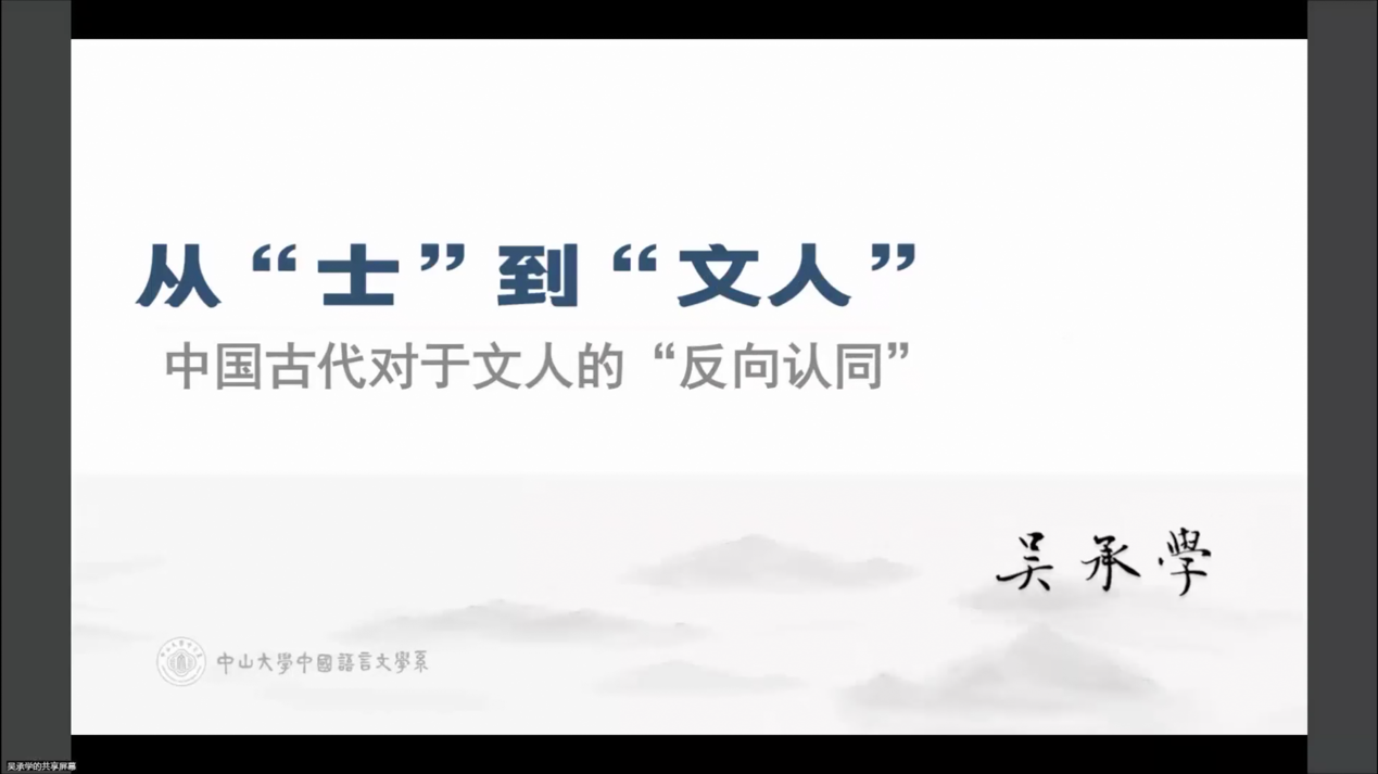 2022年12月7日下午,中山大学中文系教授、博士生导师、中山大学“逸仙学者”讲座教授、教育部“长江学者特聘教授”吴承学先生应邀做客“北外文华讲堂”,以线上方式作了题为《从“士”到“文人”——中国古代对于文人的“反向认同”》的报告。报告由北外必一运动学术委员会主任魏崇新主持,必一运动经理詹福瑞、副经理方稚松以及学院师生共一百余人参与。